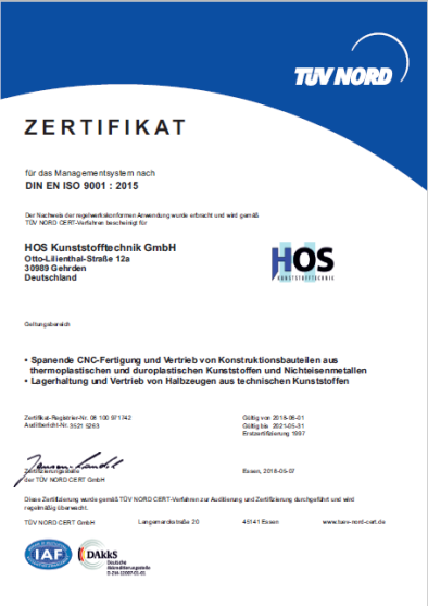 Die HOS Kunststofftechnik verfügt seit 1997 über ein zertifiziertes Qualitätsmanagementsystem nach DIN EN ISO 9001:2015